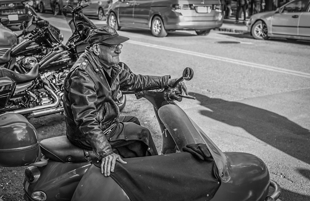 Ed, interesting image. Yes, he looks like somebody from "La Cosa Nostra". The man is well placed in the frame. To me it looks too contrasty with little detail. I added light to the shadows, and now you can see better the face. Added a vignette to take away some of the distraction in the bright background. |