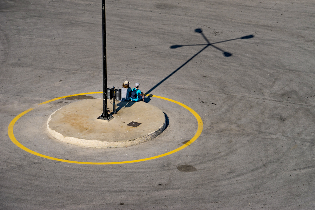 Daniel, simple, but at the same time a complex image, two individuals framed by the pole and the shadow of the pole in the ground, as well as additional geometric images with the bright yellow circle also framing the individuals. At first I thought there was too much empty space to the right, but after cropping t, it really changed the whole aspect ratio, so I desisted. I just added some light to the shadows to see more detail of the individuals, and added saturation to the yellow circle to make it more predominant. |