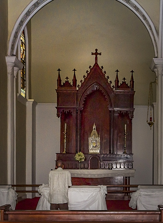 Gloria, this image denotes peace and tranquility as the title states. The man is well placed in the frame, and the altar is off center. Due to the little ambient light, the head of the man gets lost in the dark wood. The image is sharp. I added light to the shadows to separate the head from the background, and just cropped slightly from the bottom. |