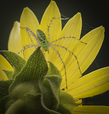 Vic, great capture indeed, and your PP brought out a lot of detail in the flower. The spider is tack sharp, your f/10 gave you enough DOF for all the details in the spider's legs. I agree with cropping some of the flower, but I think Sarah did it too tight specially on the top. I would have done it slightly more square. Cloned out a couple of orange lines in the lower right and added a vignette. |