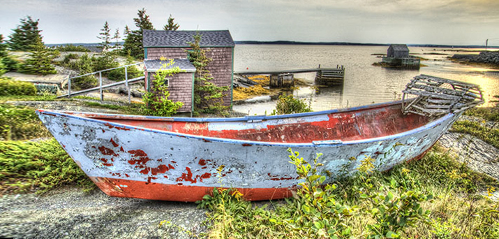 Joe, interesting landscape with good composition. I agree with Guy that the bright red building competes with the boat, so I desaturated it a little more than Guy. Also cropped the image at the bottom to make it more like a panorama and to eliminate some of the extra green in the foreground, and adding some canvas to the front of the boat.