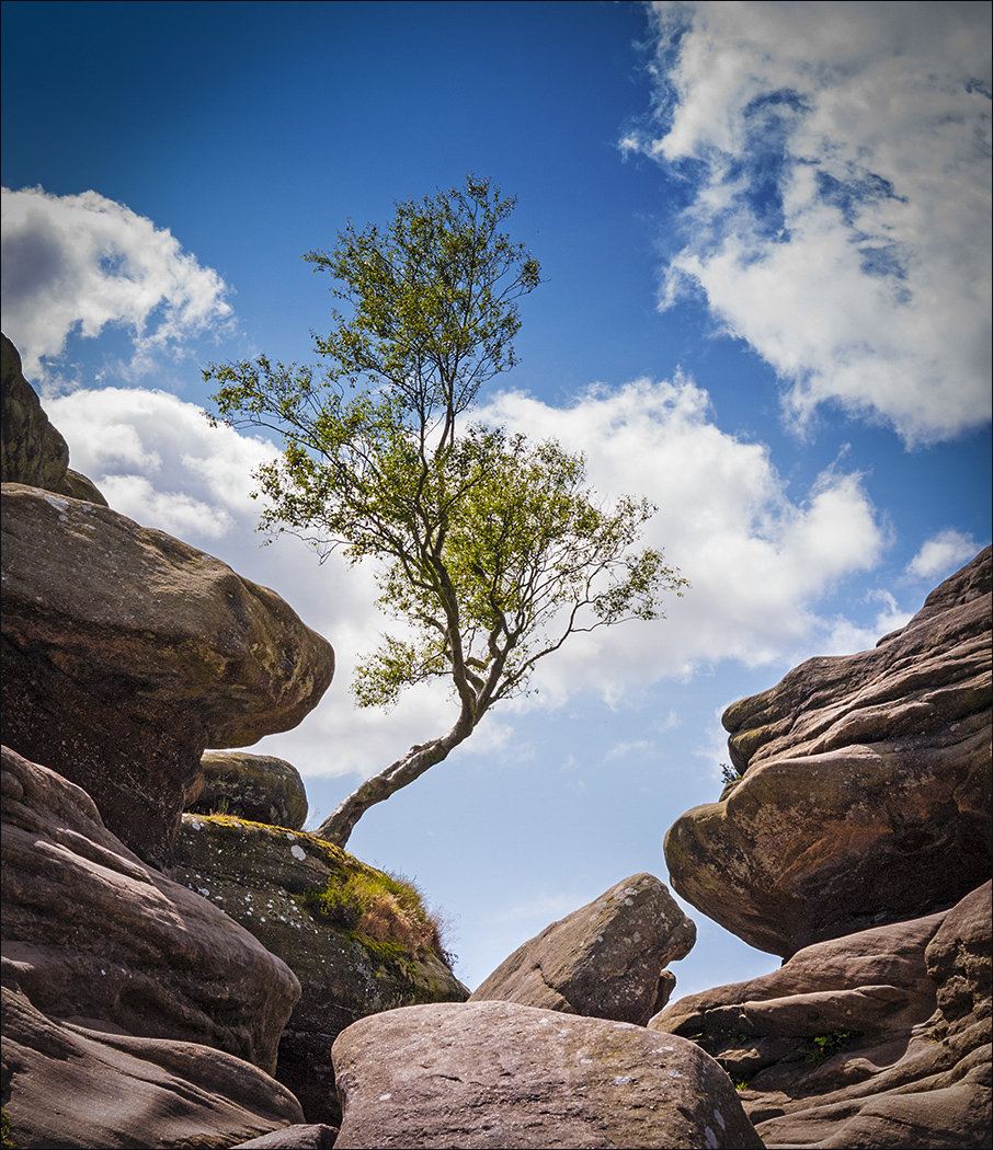Guy, interesting and difficult shot per your description. Great composition, and indeed the spaces framed by the clouds mimic the space framed by the rocks, with the tree nicely placed without obstruction. I increased the saturation, specially the green, and added a slight vignette. |