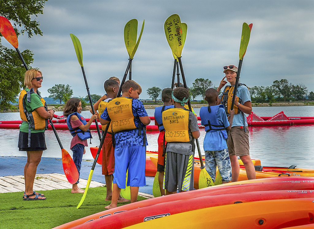 Dan, your image is full of bright colors. It is sharp, and nicely composed with the children framed by the two adults, one of which is looking at you. The children are paying attention to the explanation. I also like the way the kayaks frame the children in a V shape. I just added some light to the shadows to see more detail of the faces. Also cloned out a red structure behind the adult with the green shirt. |