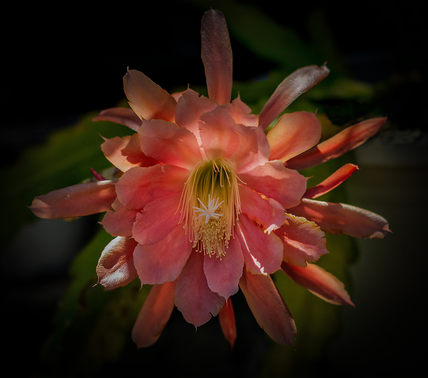 Nat, beautiful cactus flower. I personally like the original image in its "natural" environment. Your extraction, first distorted some of the flower petals, and when placed in a total black background looses realism and looks suspended in a black space. I took your original image and reduced some of the brightness. Unfortunately, some of the petals are overexposed and no pixels could be recuperated, then the blown areas. I added some contrast, clarity, and created a very strong vignette, which hides most of the bright areas, and still leaves some of the real environment (green) , without being distracting. |