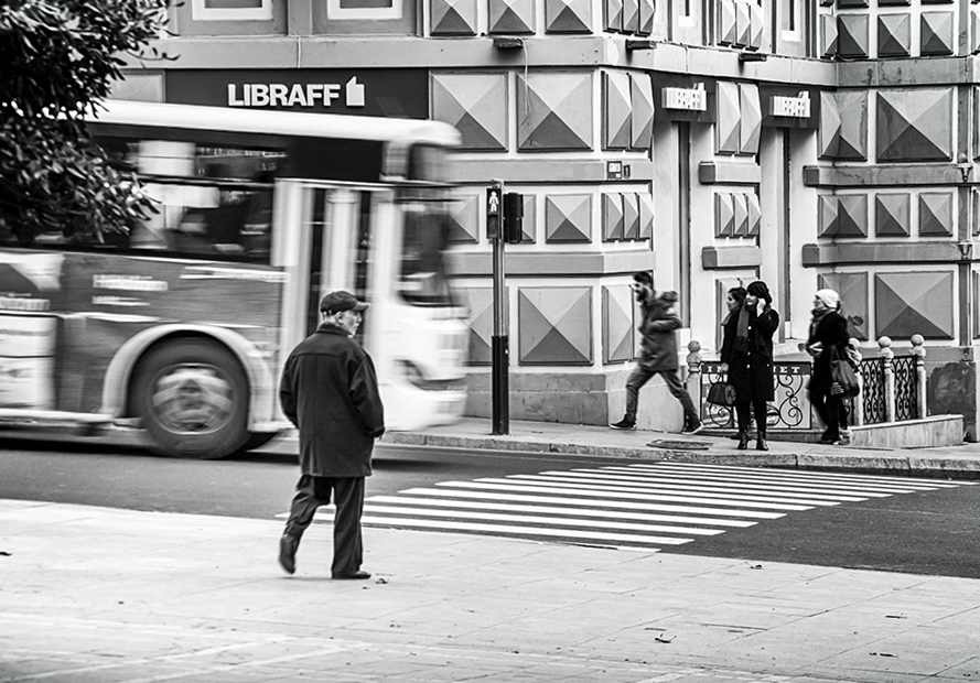 Hassan, I pretty much agree with Dan and Jim's comments and I did crop out the lady on the right of the frame since being so close to the edge creates tension, plus being away from the central action. I also made the image straight (the verticals).Additionally, added some light to the shadows and now we see more detail on the people's face, and added contrast. Good Black and white interpretation. Really depict movement on the street (bus and people). |