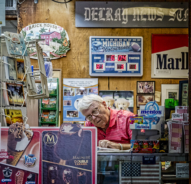 Gloria, indeed a very busy image with lots of distractions keeping your eyes all over the place. Agree with cropping but not so tight as Jim did, so the attendant still remains on one of the thirds, and since it is a smoke shop I left the incomplete Marll and news signs. Obviously, the man is distracted reading something, and I agree with moving closer and get more of the man's. |