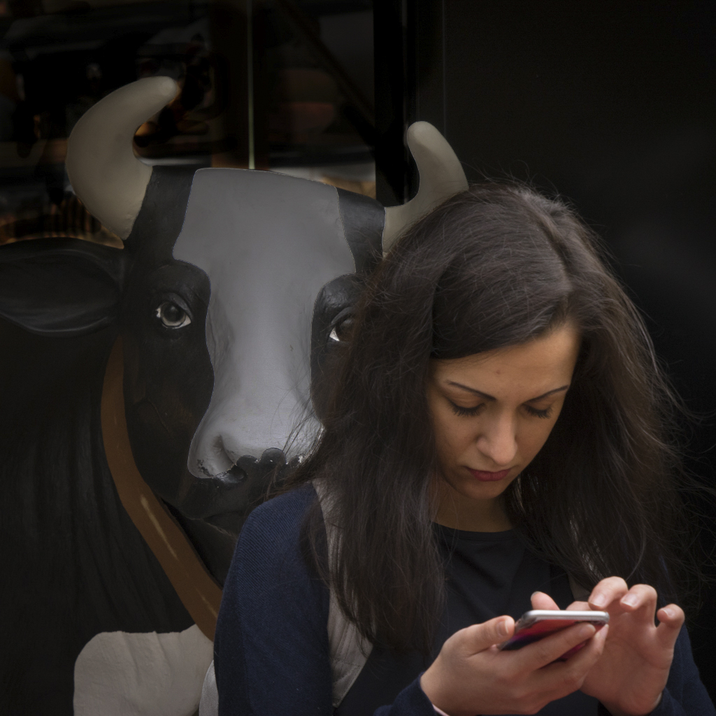 Daniel, good catch. Indeed the bull is watching her.... Now, the very white front of the bull including the horns takes my eyes immediately to them, not paying much attention to the woman who is the center of attention. I dimmed down the whites making it less distracting and absorbing, and I personally like the image more flipped. Agree with Jim to darken the background. |