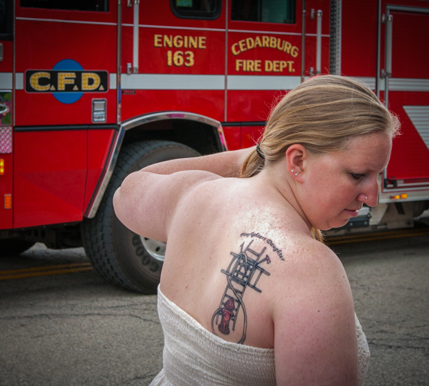 Dan, indeed the woman's tattoo is allegoric to the fire department, so I wonder if she was part of the parade or just part of the observers. It is unfortunate that you had to amputate her right arm. Since you story is about the fire department and related, I cropped the image so the amputation is not obvious, and the fire truck still shows the message. Added a slight vignette. |