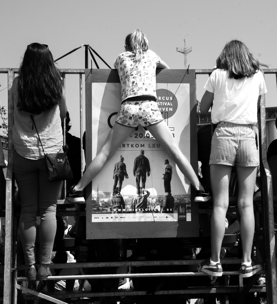 Daniel, great shot. I like the way the little girl in the middle is framing the three men in the poster, and at the same time, she is framed by the two females on her side. The image is sharp. The B&W rendition needs a little more contrast, it is too grey. The two persons on the side are cropped too close creating tension.