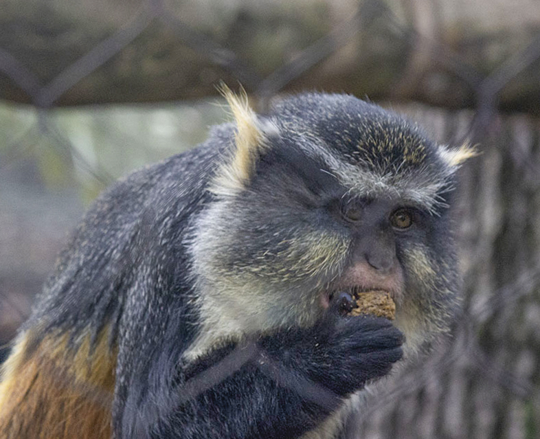 Tony, interesting primate. You captured him in action eating something. I just wonder if you could have changed your vantage point to create the image without the heavy wood background. Also the image is a little dark and there is not much detail in the eyes. I cropped slightly and added some light to the shadows, and now you can see the eyes. Also made the background wood straight. We do not have the original image to compare and see what was your PP. |