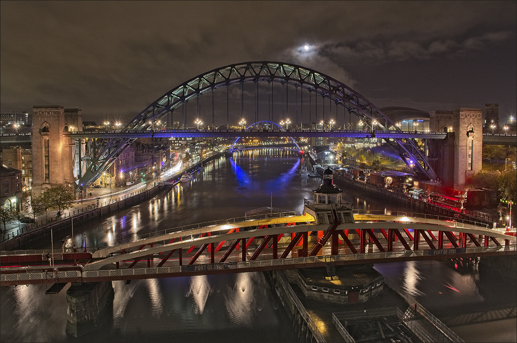 Guy, perfect vantage point to be able to include the sequence of three distinctive bridges each one with different shapes and construction characteristics, with the added interest that each one is illuminated by a different color of light. I like the sky with dense clouds and just opening slightly to let the moon show up. It is sharp. The 10 seconds exposure created a soft water surface. I also agree with the distracting very intense and large illuminated sign in red reflecting of the building. Fixed with the selection and content awareness fill and the clone stamp. |