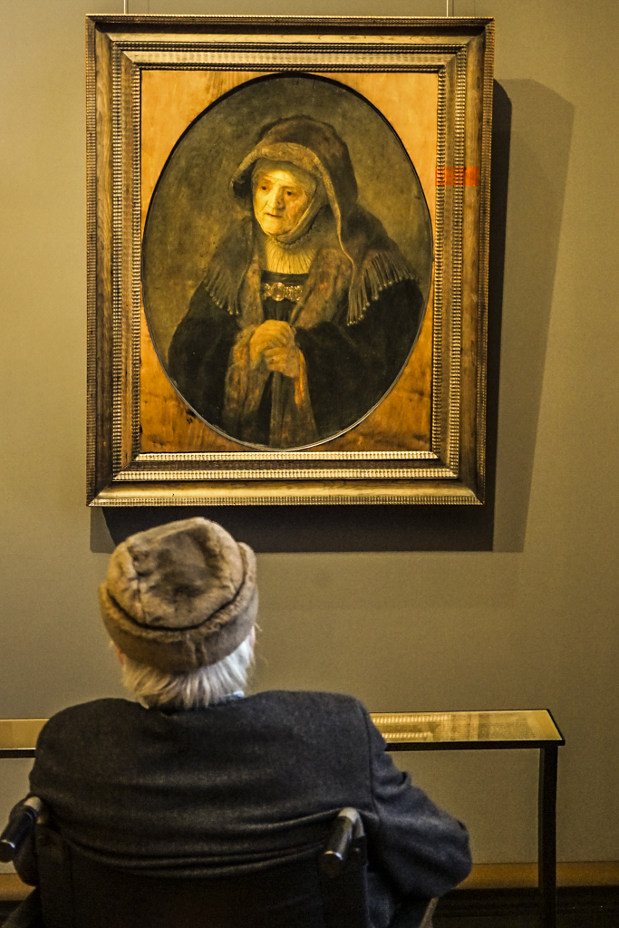 Daniel, this is a very intense image. It has a very profound story telling. The body language of the disabled person really looking at the painting, which in fact reflects an old lady with a sad look, the subdued light room with the intense shadows also make the image more powerful. The few colors present in the frame, except the red band on the frame of the painting also help to make the image kind of gloomy. The image is slightly soft (1/30 sec and I presume hand held and the high ISO:12800) so I added some clarity which intensifies the mid tones giving more detail to the image, also added some contrast, and finally removed a couple of color signs in the back of the wheelchair and also the intense shadow on the left side of the frame, which were somehow distracting. Great image indeed. |
