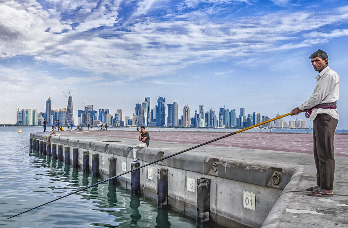 Hassan, I like the way the pier works as a frame as well as a leading line towards the cityscape in the background, which is sharp (f/16). The fishing rod crosses the pier making an X right next to the sitting observer . I agree with Gloria about the crop. Also I worked the sky to make the clouds more obvious. The placement of the fisherman in the frame so close to the edge indeed creates tension. |