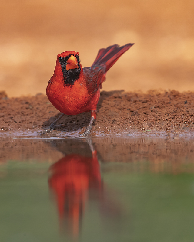 Bruce, beautiful image of the cardinal in front of the water with the added reflection which adds interest. The body of the bird is completely sharp, but the tail is a little soft. The distance from the beak to the tip of the tail is a lot more of what the DOF of a long lens with a TC can handle, but it is expected. The body language is great. I made the catchlight on the right side a little more obvious. Good cropping and handling of the background which is muted and not distracting. |