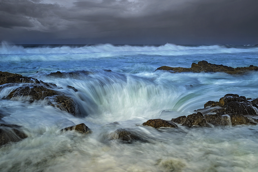 Walt, great image, sharp and with elements of interest in the foreground, midground and the stormy sky in the background, which looks more dramatic in your PP image. You were also able to bring out color in the water, and with the 1 sec exposure the silky effect of the water falling into the well. With a little imagination, in the original image you can see a giant monster's eye looking at you just in front of the well. The partially included rock at your lower right of the image seems slightly distracting. |