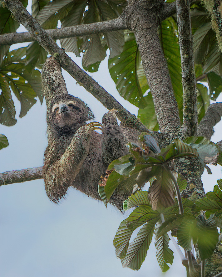 Adrian "Pura Vida" as they say there. Great capture, sharp and the sloth is looking towards but not exactly to the camera. I see a green hue all over the exposed hair. Is this moss growing out of it ?? You were able to bring out some color and light in the face, but it is still slightly dark. I added some more light to the shadows, cropped the lower part of the frame as suggested by Bruce, and added some vibrance. |
