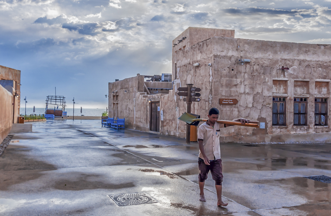 Hassan, indeed early morning worker already carrying his tool. I like the solitude of the area with the water puddles creating reflections of the first light, and the buildings creating a path at the man and leading line towards the ocean. I reduced slightly the brightness and added light to the shadows, now we can see the man with more details and also straightened the verticals. |