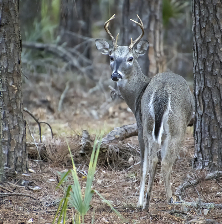 Erik, perfect timing. The young buck is almost camouflaged within the landscape. He is very sharp throughout and the cream is that he is looking at you and has a nice catch light. Additionally, he is framed twice: by the tree trunks as well as the three green bushes, two in the back which are out of focus and the one in the front. I cropped a little of the trunk tree on the right of the frame (my left) to remove the green bark which is slight distracting and a little from the bottom, still keeping the square format. |