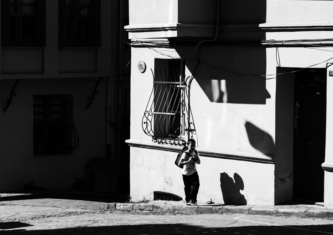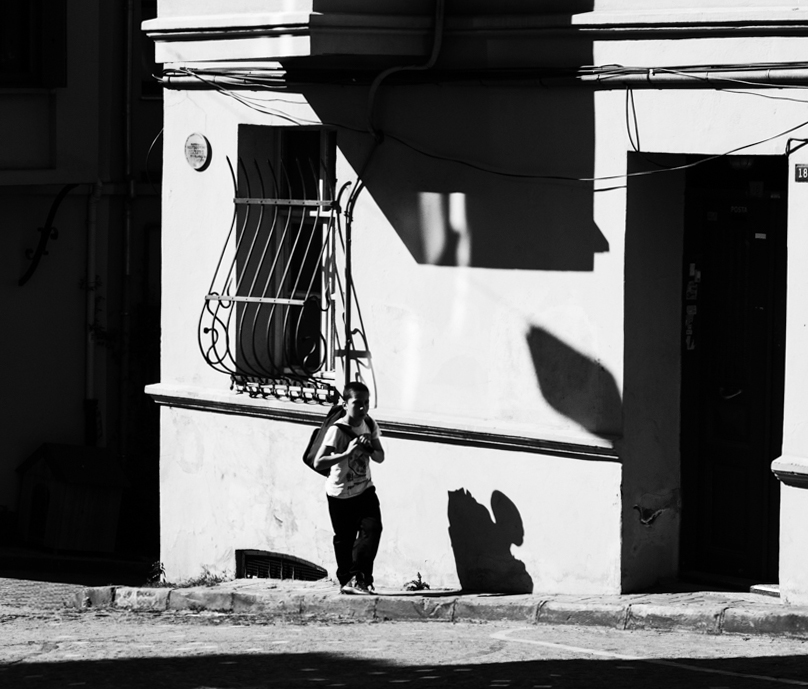 Hassan, this is a very high contrast and harsh light image, almost of graphic arts characteristics. The presence of the very bright areas compared to the dark areas keeps my eyes going all over the place until I find the young man with a back pack in the frame. He is back and side lit which creates a strong shadow on his face therefore no detail, I played with two different crops to progressively eliminate the distracting elements (very bright) and to bring my eyes directly to the student. I think I like the second option better, since gives more presence to the human component in this array of claro-oscuro elements. Also made the vertical lines straight. |