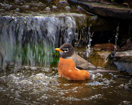 Marie, welcome to our group. This is a nice image of the Robin taking a bath. The image is sharp and shows a nice natural environment. I think your crop is too tight and took away almost the whole environment which in nature adds to the image. Also your crop left the bird with no room to move into it creating tension. I took your original image, adjusted to color, vibrance and texture and did a different crop, eliminating also the very blurred background, also added a light vignette. Now the bird has room to jump around, and shows his relation with the nice nature. |