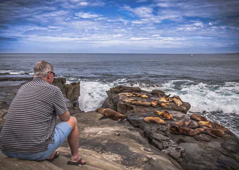 Dan, indeed the man is very close to the seals. He probably enjoys the very strong Ammonium smell from the seals urine. The image is sharp. The colors are well balanced. My only observation is that he is touching the edge of the frame which creates some tension. I added some light to the shadows, and now we can see more detail of the seals and rocks. The horizon line is well placed in the upper 1/3rd. |