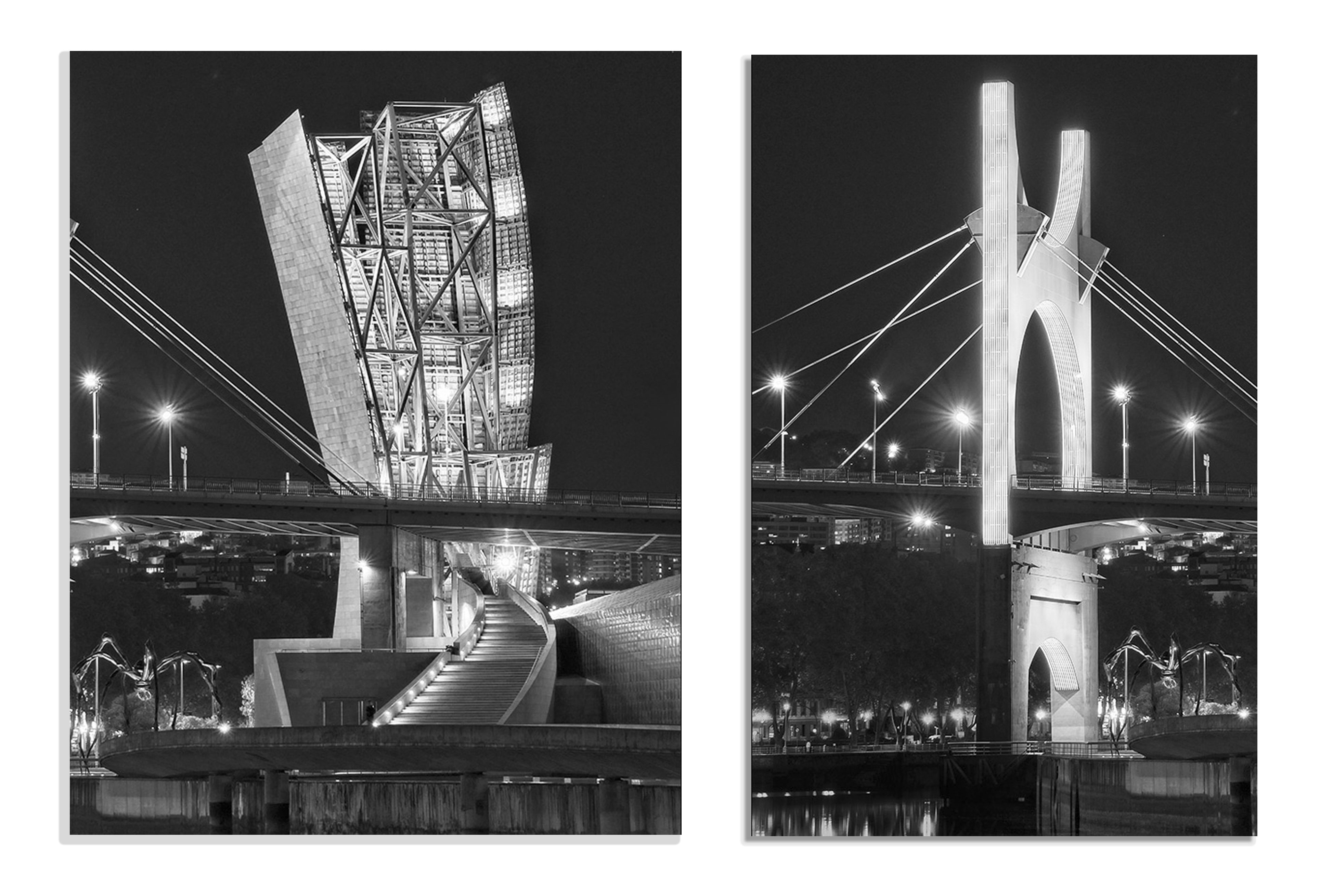 Guy, the image is very sharp, the B & W tones are perfectly managed without overexposure in the whites. I must agree with Erik that you can make two different compositions with the content of the frame. One structure is competing with the other being both architectonically interesting but apparently unrelated. I cropped into two images and mae a composite changing the placement on purpose to show that each one can stand by itself. |