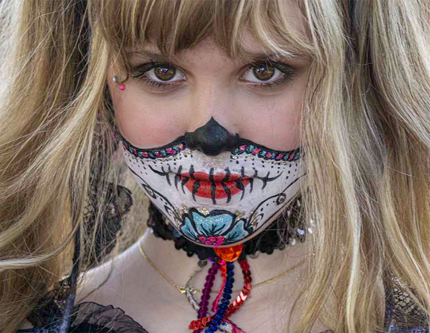Gloria, good representation image of the day of the dead. The young woman had a good painting job on her face. It is sharp and sidelith. My only observation is that you amputated several fingers of her right hand crating a distraction pulling my eyes in that direction. Perhaps it should have been included completely, or not at all. The catch light adds interest. |