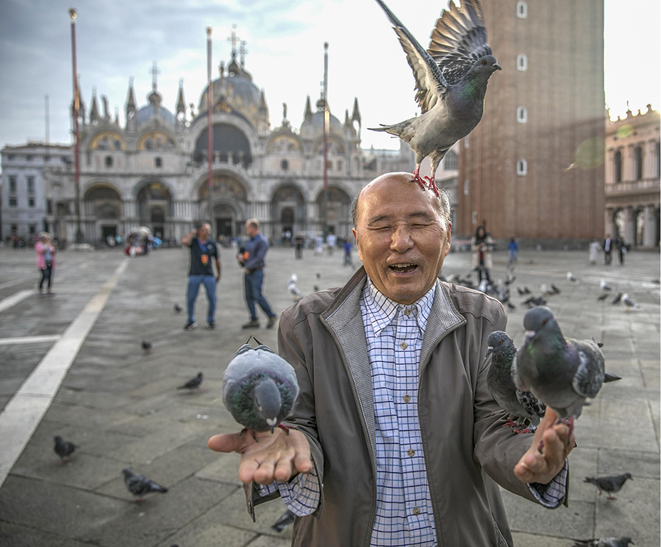 Lauren, Nice photojournalistic/travel image. Iconic of the site. I like the way the oriental gentleman closed his eyes upon the pigeon taking off from his bald head. The blurred background on his right complements the image and does not compite with the main subject, still denoting location. I think that the background on his left does not add, but perhaps creates some distraction, so I cropped it and took him off center. The man is sharp. Added some light to the shadows, and reduced slightly the highlights. |