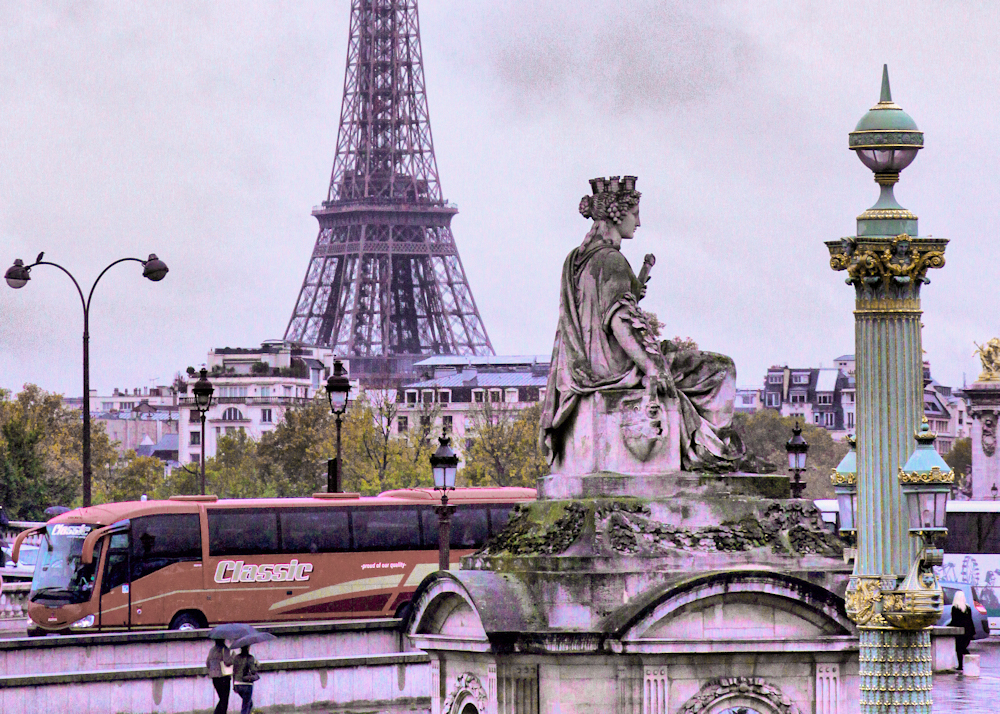 Jim, interesting image of Paris and the Eiffel Tower, where the emphasis was not placed in the tower (most iconic structure in Paris). I like the way you cropped the image to bring the interest to the other sculptures in the foreground and midground, and leaving the tower as background. All the levels are sharp, and the presence of the human component adds scale to it. Now; I see a very strong blue hue (raining ??, people walking with umbrellas) and the presence of the very red bus which takes my eyes directly to it overpowering the rest of the image. I did do a white balance adjustment and lowered the saturation of the red bus so it gets blended with the rest of the image. |
