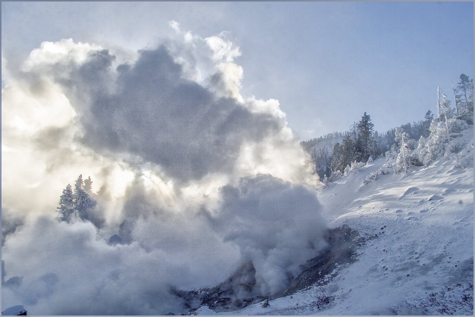 Mary, very impressive the way the hot vapor coming out of the spring creates this magnificent cloud at ground level. Looking at your PP iteration it has a very strong blue cast throughout, specially on the white snow, which is not apparent in the original, unless you mislabeled the images. It is sharp. Anyway, I used Viveza 2 adjustments points to give some more structure to the vapor cloud, and try to repair some of the overexposed areas on it, also removed the blue cast from the snow. Upon increasing the structure on the cloud, a lot of sensor dust spots became apparent, which I cleaned as well. |