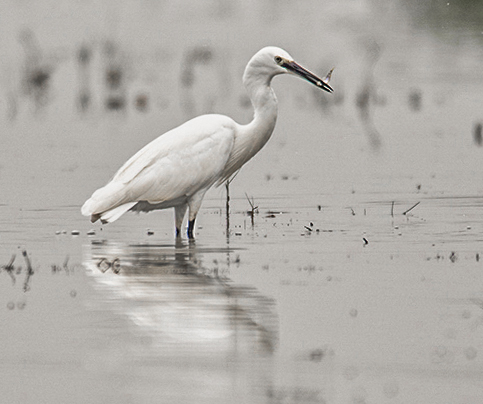 Abhijeet, good timing in this action shot. They swallow the fish in a fraction of a second. You were able to bring out nice colors considering the light condition, and you were far indeed since at 600 mm the main subject is very small in the frame. On the D750 you only have 24 megapixels, so the cropping was considerably and you still have detail. I also like the reflection. Now I think the crop in the back of the bird is too tight and the horizon line is falling backwards. I took the original image which unfortunately it is at a very low resolution so it does not give me pixels to work with, anyway, I straightened the horizon and made the crop a little more loose, however could not bring back enough detail and color to compare to your PP image. |
