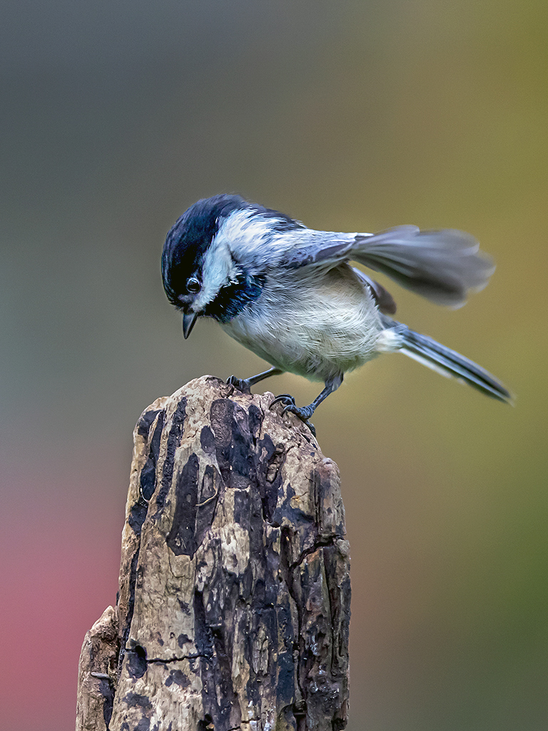 Bruce, god capture in your backyard. I do not think I have seen one of this little birds around South Florida. It is sharp, and apparently you captured him/her right after landing and the left wing is still in motion with a slight blur which add interest to the image, or thee bird is just stretching its wings. The background is a beautiful kaleidoscope of colors, very subtle and completely out of focus with no distraction. Nice crop. My only comment is that the head looks very dark and with no details in the plumage. I just did a selection of the dark area and added some light to the shadows. |