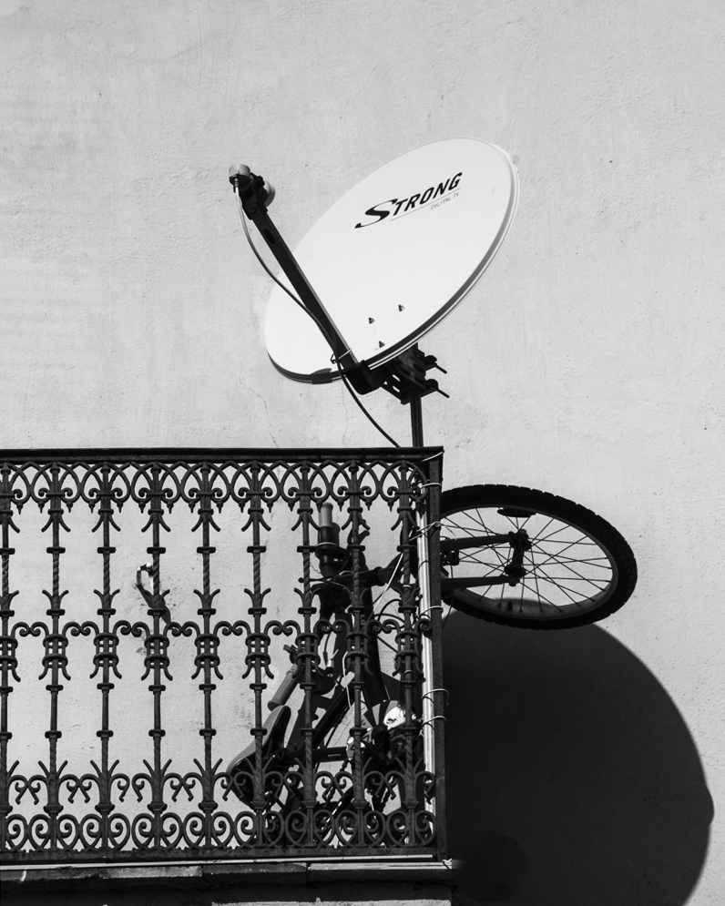 Daniel, interesting observation/creation. I like the juxtaposition of the satellite antenna disk shadow against the bike's wheel. It creates an abstract figure. It is sharp. I think that your crop has a lot of empty space that does not help the image, in fact; the dark column on the right of the image is distracting, as is the empty space above the antenna. I cropped the image as a portrait and 8x10 relation , made it straight, added some contrast and removed a few black spots in the background. I am sure that if you return at different times of the day you will get a variety of shapes. |