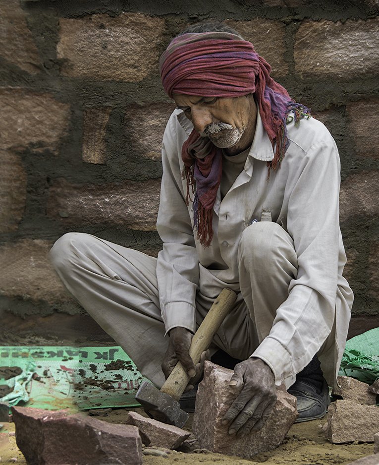 Bruce, good photojournalistic/street photo showing the worker deep in thought and doing his job. Incredible how they work the stones with bare hands and a hammer. The earth tones of his clothing and stone background is broken by the very bright green mat he is sitting on, but it is what it is. Good composition with his lower body and arms in a triangular shape. It is unfortunate that his right knee is just at the frame edge creating some tension. I just wonder if you have a little more real estate to his right before cropping it. The colors are well balanced and it is sharp. |