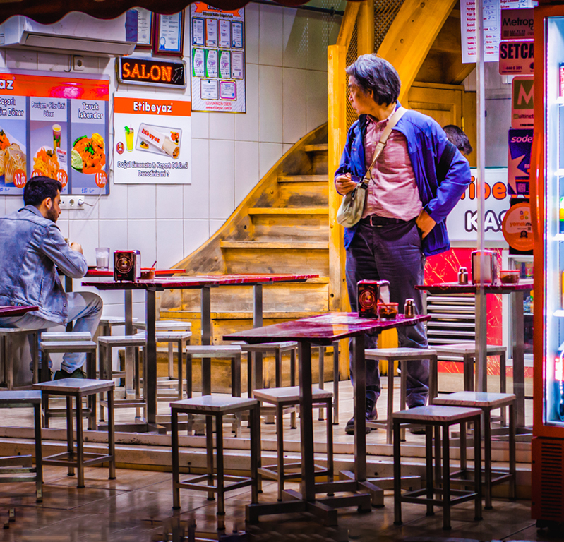 Hassan, interesting image. I had the same experience when we visited Istanbul a few years ago, We went to Ortakoy and ordered our food signaling with the finger to the waiter. Anyway, you image is full of color, in fact I would say too saturated especially the orange/yellow tones and has a HDR look . The refrigerator full of soft drinks is so illuminated and with multicolor containers taking almost 1/3 of the real estate, which in actuality are competing with the main subject which is the man trying to figure out what to order. The yellow staircase takes our view up and makes us wonder what is up there. The man at the opposite edge eating is right at the edge of the frame creating some tension. I did a few od adjustments including cropping a little on the top eliminating the numbers which are a little distracting, did a content aware fill on the lower corner, decreased a little bit the saturation of the yellow/orange on the man's skin, and cropped out the large refrigerator to a square shape leaving just a little edge. |