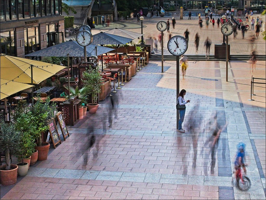 Guy, well done. Great ghost effect. Lucky that the frozen bystander did not move for the 2 seconds exposure. Interesting arrangement of the clocks. Very creative artist. Your vantage point shows us all about the site. Sharp where it should be. My only observation is the brighter are on the right upper square (my right) which pulls my eyes directly to it first. Using the new masking features (brush) in ACR I reduced it slightly. |