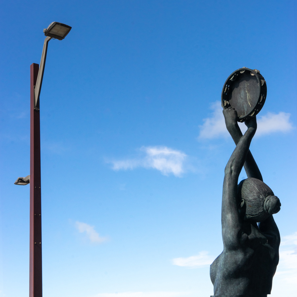 Daniel, you selected a vantage point where the tambourine (pandereta in Spanish) is aligned with the lamp which for technical purposes may represent the basket to which throw the simulated ball (tambourine). The image is sharp, and there is nice contrast with the blue and cloudy ski. Lots of stories can be drawn. |