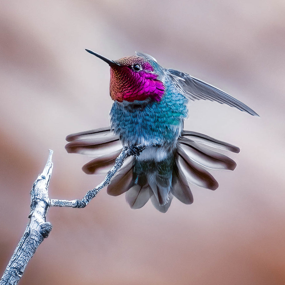 Marie, what a great pose is the hummingbird giving you displaying his tail feathers. This is a male, since the female does not have the colored plumage in the head and neck area. Now, the color is a little off with a bluish hue that you can also see on the wooden stick, perhaps is the result from the desaturation of the background. The plumage should have a tint of green which is present in the original. I am impressed by the quality of the image after this super crop on a cropped sensor camera's file (no pun intended). Perhaps doing a selective desaturation off the background will retain the green tint on the plumage. I just reduced the blue hue with improvement on the color. Also made the stick come in from the angle (my thing). |