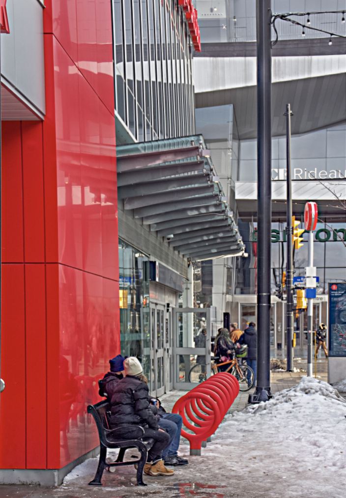 Bruce, patience pays off, and yes, I do think this image qualifies as a street scene. Indeed it is a complex convergence of the pedestrian walkways, and the presence of the human component, specially the person with the red umbrella, gives scale and life to an otherwise sterile image (good as lines/architecture, etc). The contrast between illuminated and shadowed areas also give Interest to the image. It is sharp. Now, as far as how much to crop, it is on the eyes beholder and depending on what do you want to emphasize. It looks like a couple of the walkways are descending to an underground area |