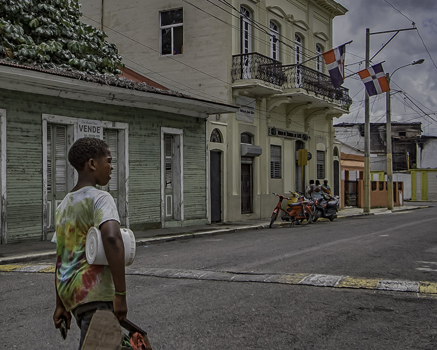 Gloria, interesting street scene in the Dominican Republic, given by the flag if you would not have mentioned it. It is unfortunate that the boy is walking and looking away from your vantage point, and the fact that his shoe shining business box is amputated, which happens to be the title of your image. The image is sharp, straight, and the colors consistent with a cloudy day (soft shadows). I just cropped it except the lower edge to remove some of the distracting items, and desaturated the red sign above his head (For Sale). Now the image reflects the mood of the moment, frustration, walking away into the street. |