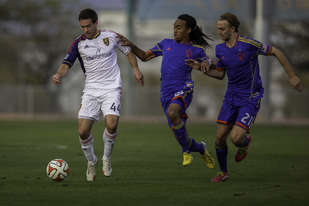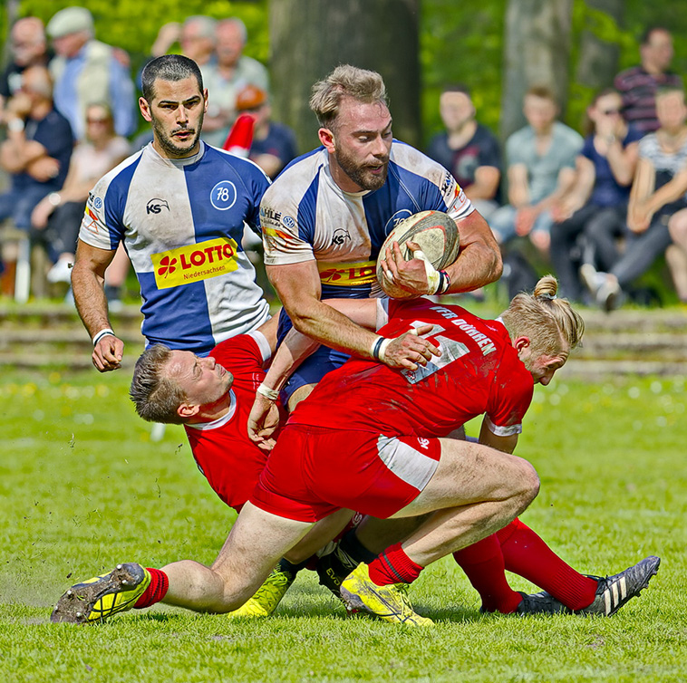 Hans, great action shot, and it looks like Kain Rix is determined to protect the player with the ball. The two guys on the ground dressed in red are really struggling to stop them. In any sports event and if you are shooting at eye level like you did it is impossible to avoid the background people, but it is good that you were able to blur them with f/3.5. It is unfortunate that the player in blue his leg is partially amputated at the edge of the frame. Cropping him out I think it improves the image |