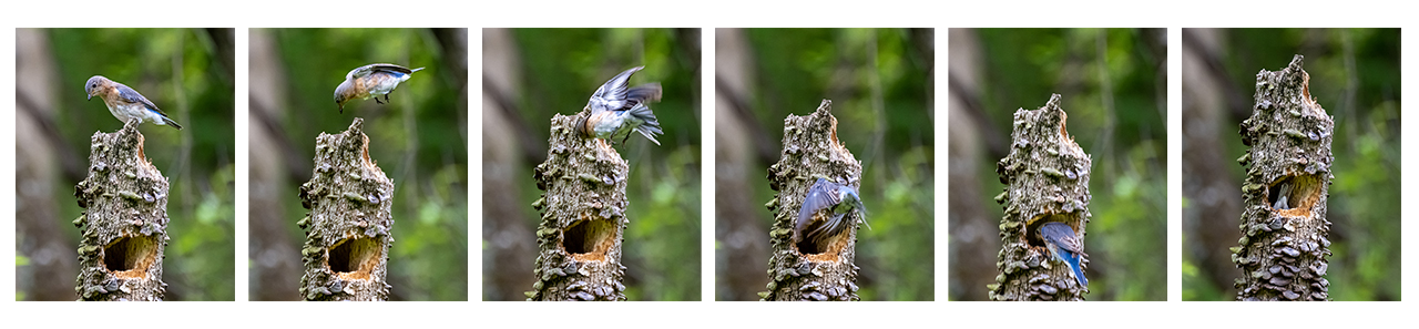 Ian, nothing bits being prepared and use the burst technology in our cameras. This warblers are very fast and difficult to photograph. All the perching birds share some characteristics, such as being fairly small, vocal, and insectivorous. Of course they take advantage or pre drilled holes to nest. What more convenient than the cannon of this flying machine. I am attaching a sequence of a blue bird I was photographing and with no previous notice it flew into the hole probably done previously by a woodpecker. All 6 images took less than 1 second (I had my new Nikon Z9 at 15 frames/second) |