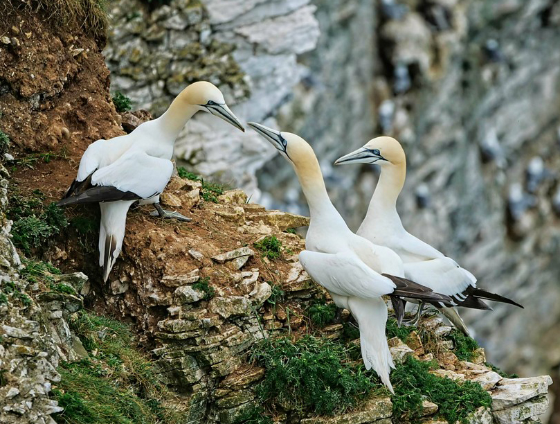 Guy, great capture. It looks like a "menage a troi". Beautiful scenery telling a story. I like the blurred background with the multiple birds nesting. The contrast of the rocky area with the greenery and the light color of the birds blends very well. I do agree with Erik. This is my interpretation |