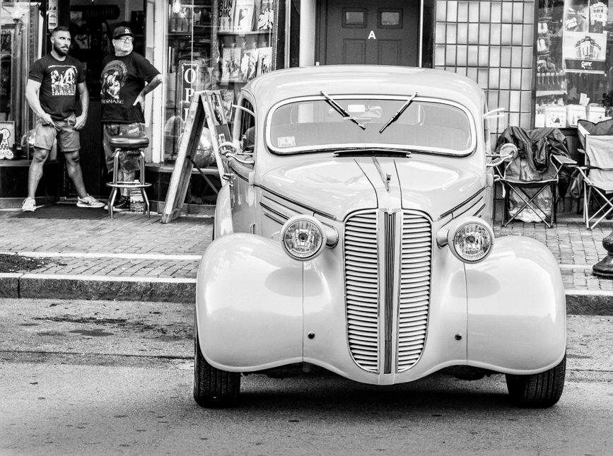 Sally, indeed you like old cars. Interesting model and in the color version the yellow is very bright overpowering the rest of the image. In your B&W interpretation the car kept the brightness. I did a couple of adjustments including reduction of the brightness by 1/2 stop with the masking tool in Lightroom I selected the subject. Also cropped to remove the amputated car and the light pole and to place the car off center. The two guys in the background just give dimension to the image |