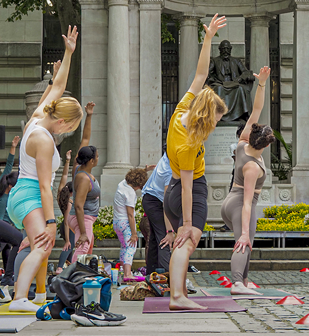 Bruce, great action image with peak of activity. I personally think that Yoga is a whole body exercise, therefore I prefer to show the whole body doing the pose and tells the real story. I took your original image, did some adjustments in LightRoom and cropped as shown. The image is sharp and the colors are bright. Did you get any images from the front of the participants ? The statue is checking that the movements are done correctly. BTW he is William Cullen Bryant, an American romantic poet, journalist, and long-time editor of the New York Evening Post. Born in Massachusetts, he started his career as a lawyer but showed an interest in poetry early in his life. He soon relocated to New York and took up work as an editor at various newspapers |