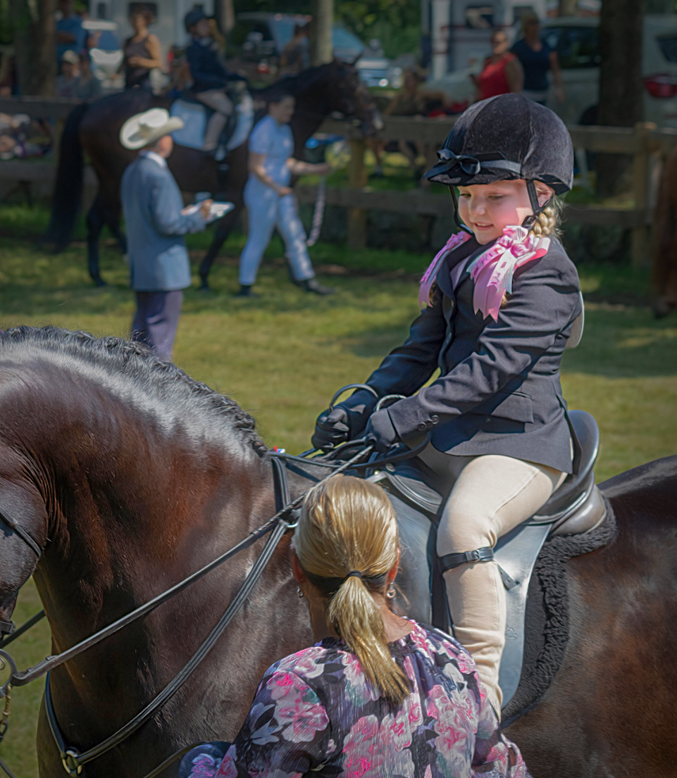Sally, this is a very cute image and shows the interaction of the young rider and probably her mom/trainer. Your original PP made the image better, but still there are a lot of very bright areas that really takes prevalence competing with the girl's face. Using the masking tool in ACR and doing several selective adjustments I increased the light in her face, and reduced the highlights in several areas, and made the background darker and cropped the white fence in the lower border that is also distracting. |