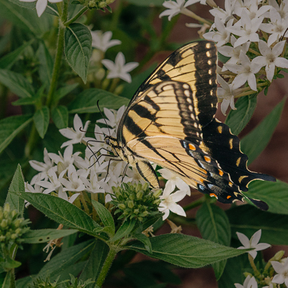 Barbara, beautiful image of the male Eastern Tiger Swallowtail butterfly on The Flutterby Snow White Butterfly Bush. Your portrait crop leaves a lot of bush/white flowers space which is competing with the butterfly. I took your original image and with a square crop and selective adjustments with the masking tool made the background/flowers darker, and added some light to the butterfly to make it stand out. The size of your image was too small so there may be some pixelation. |