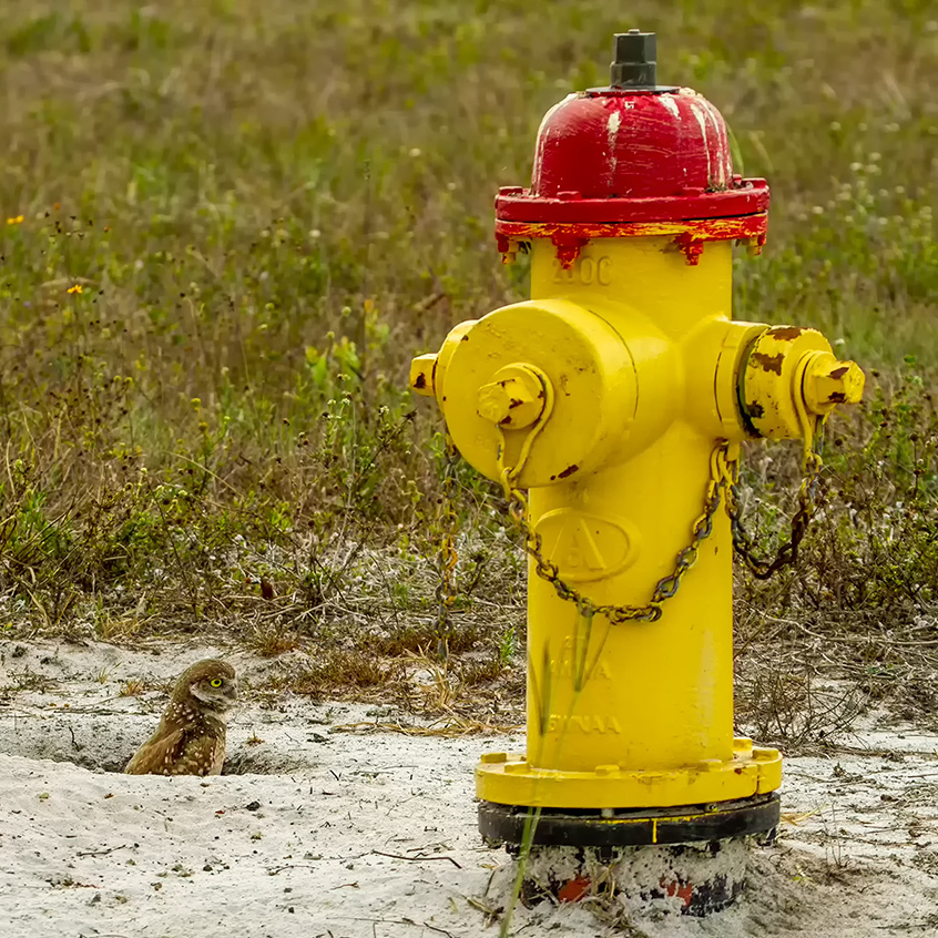 Erik, great timing to get the owl looking towards the fire hydrant, and of course the great difference in size compared to the little burrowing owl. The second owl in minding his/her own business pruning and looking away that is not adding anything to the image, in fact; perhaps creates some distraction, so a tighter crop is in order. The image is sharp and the background is not distracting |