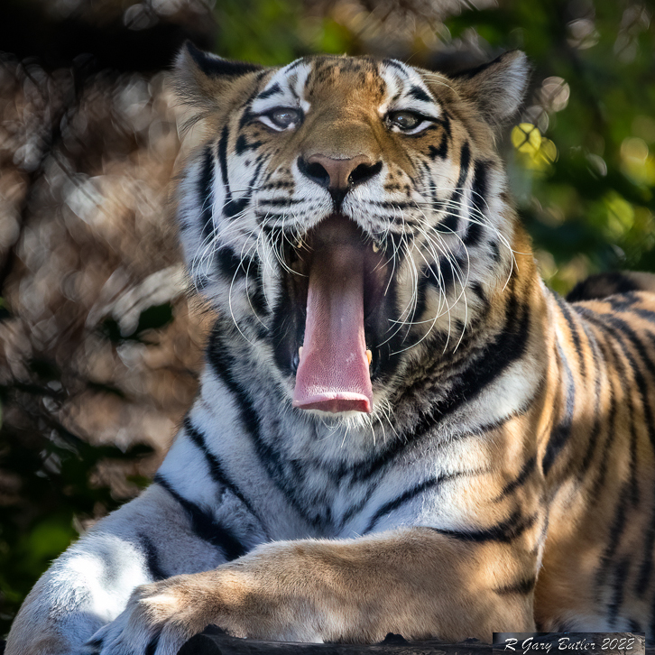 Gary, the tiger looks more bored than tired. His face is sharp. Now, most of his body is amputated so I think that a tighter crop is in order. I pretty much achieved what Guy did with complicated maneuvers in Photoshop, just using the new masking brush filter in Adobe Camera Raw: the Radial gradient to give light and warmth (remove the bluish hue) to the head and face, and then selecting the subject and inverse it, darkened the background. With the square crop, I was able to rescue your signature. |