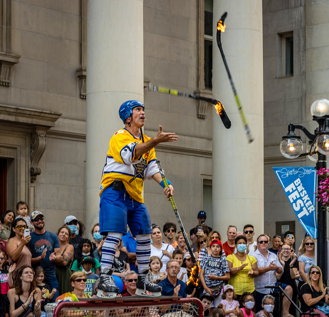 Bill, I think it would be a good idea to set up a show with these two outstanding juggles. In your image the juggler has captivated the interest of all the people around/behind him, and yes; he looks very experienced and technically capable of doing his trade. Interesting that he is standing on top of the nest's frame wearing his ice skating shoes. I find that the bunch of pink/red flowers at the edge of the frame keep pulling my eyes that way, and away from the main subject. I just cropped a little there, and added a little light to the shadows to bring out more detail |